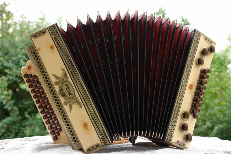 | Die Gestaltung der Knöpfe und Bässe erfolgte individuell auf meine Bedürfnisse angepasst. Ebenso konnte ich mir die Farben des Holzes und der Knöpfe aussuchen. | |